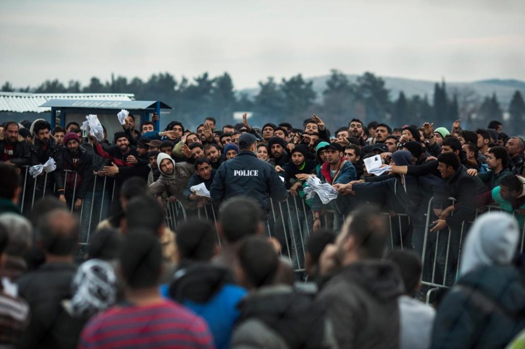 IDOMENI, GREECE – MARCH 03: Refugee men scramble for registration papers at the Greek-Macedonia border on March 03, 2016 in Idomeni, Greece. The transit camp at the border is becoming increasingly overcrowded as thousands of refugees continue to arrive from Athens and the Greek Islands. Macedonia’s border with Greece remains ‘open’ but after allowing 580 refugees a day to cross into the country at the beginning of the week, the numbers passing have fallen dramatically with only a handful every day. According to local authorities approximately 11,000 refugees and migrants now remain stuck at the border as they wait to enter Macedonia to continue their journey North into Western Europe. (Photo by Dan Kitwood/Getty Images)